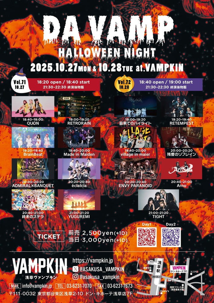 「DA VAMP Vol.71~Halloween Night~」 SCHEDULE 2025/10/27(月) 浅草VAMPKIN 地図を表示 --時間-- OPEN 18:20/ START 18:40 出演▶︎19:00〜19:20 特典会▶︎21:30〜22:30 特典▶︎サインありチェキ+ポイントカード1P --チケット-- 前売 ¥2,500/ 当日 ¥3,000 (+1D) チケット予約サイト URLをコピーする 報告する