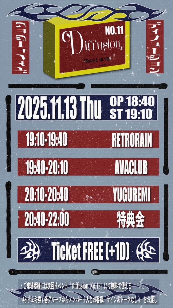 ・ご来場者様には次回イベント「Diffusion No.12」にて無料で使える「4Sチェキ券(各グループからメンバー1人とお客様、サイン&トークなし)」をお渡し