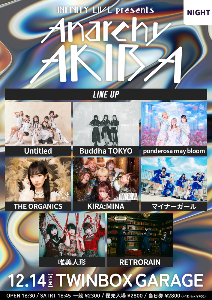 INFINITY LIVE presents「ANARCHY AKIBA- NIGHT -」 SCHEDULE 2025/12/14(日) TwinBox GARAGE 地図を表示 --時間--OPEN 16:00/ START 16:15出演▶︎16:40〜17:05特典会▶︎17:10〜18:10特典▶︎サインありチェキ+ポイントカード1P --チケット--優先 ¥2,800/ 前売 ¥2,300/ 当日 ¥2,800(+1D) チケット予約サイト URLをコピーする 報告する