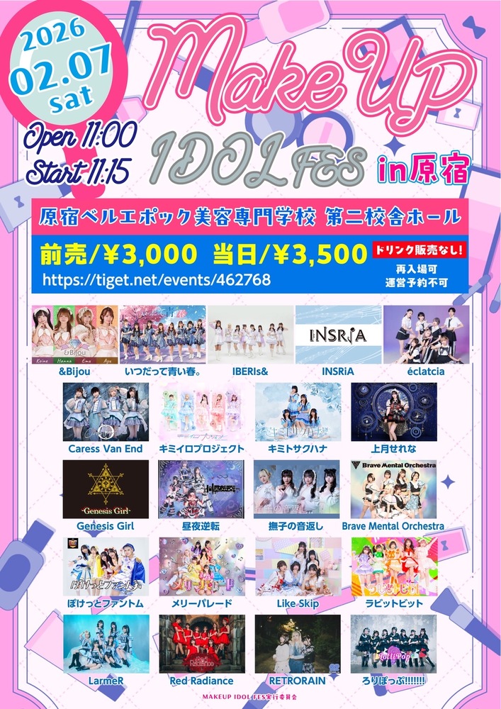 「MAKEUP IDOL FES」 SCHEDULE 2026/02/07(土) 原宿ベルエポック美容専門学校 第二校舎ホール 地図を表示 --時間--OPEN 11:00/ START 11:15出演▶︎17:25〜17:45特典会▶︎18:30〜19:30特典▶︎サインありチェキ+ポイントカード1P --チケット--前売 ¥3,000/ 当日 ¥3,500 チケット予約サイト URLをコピーする 報告する
